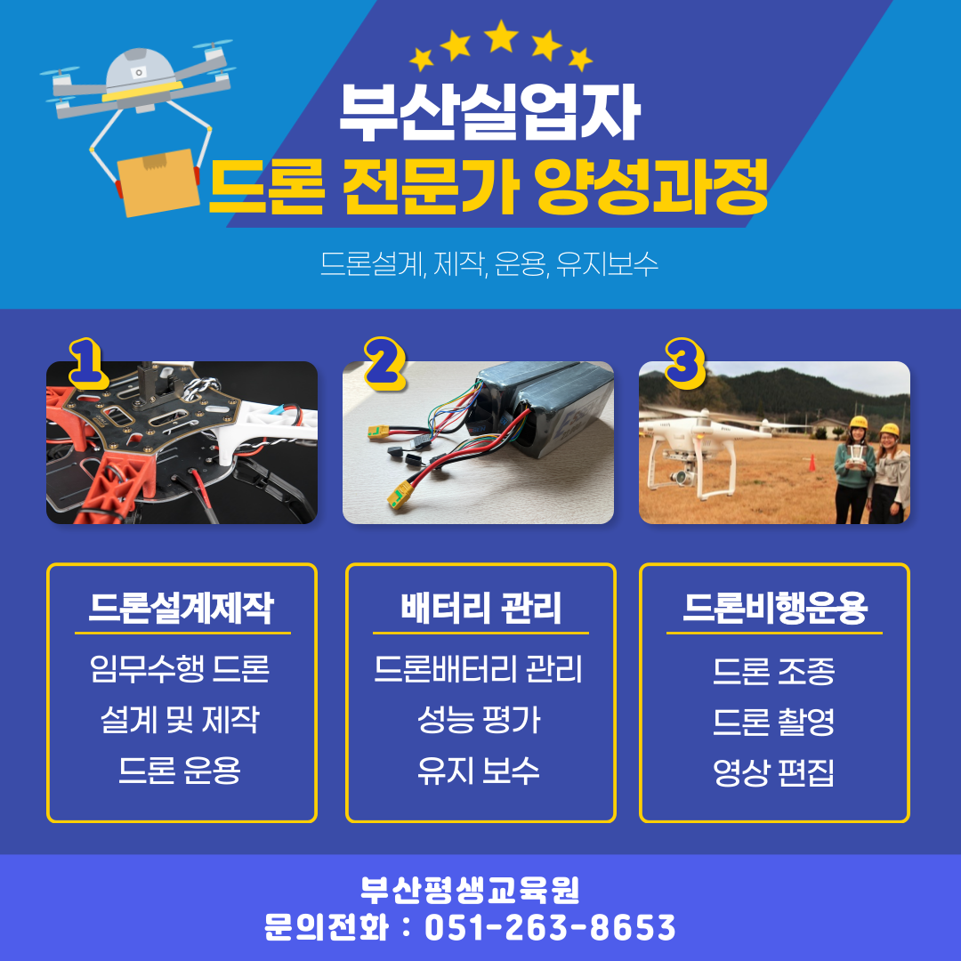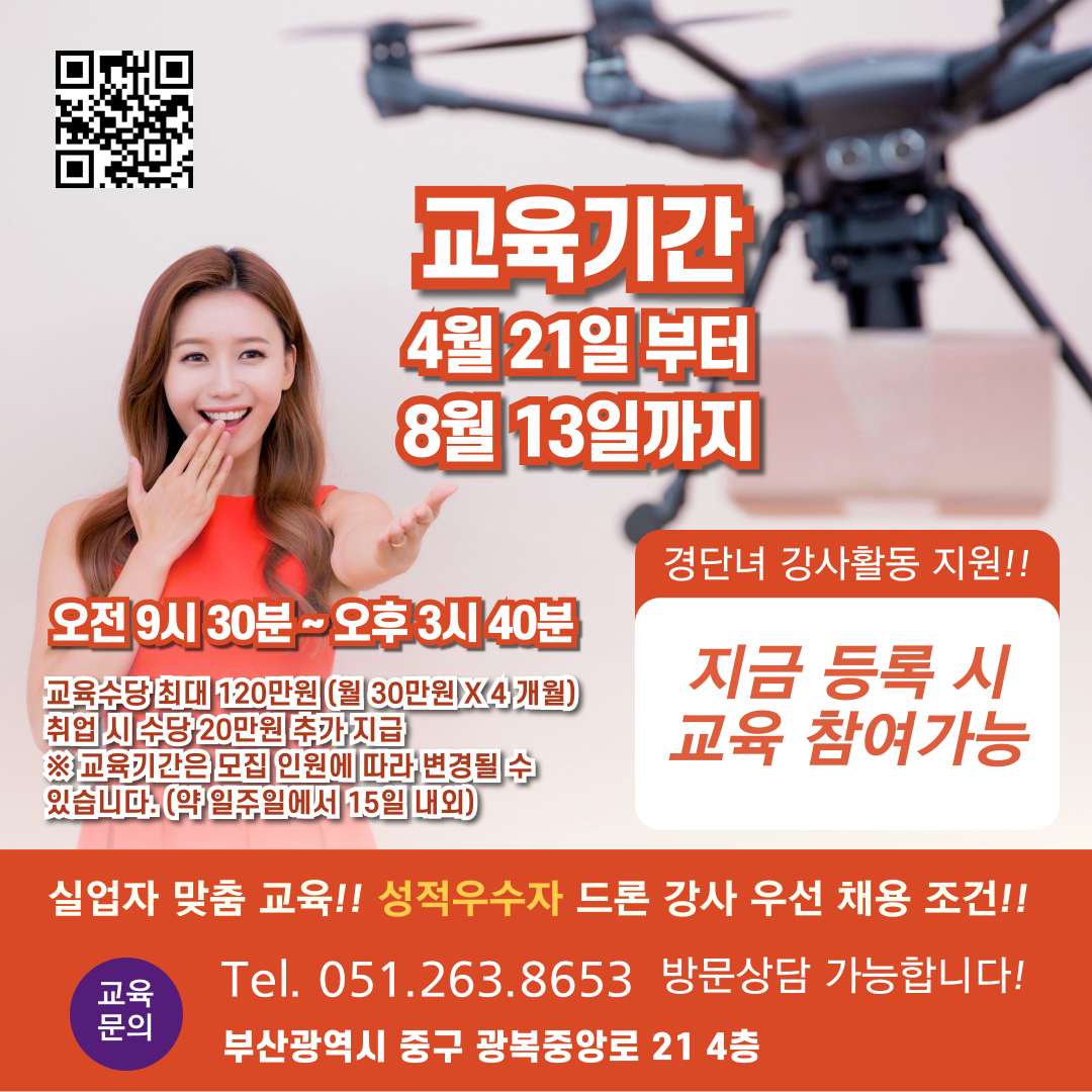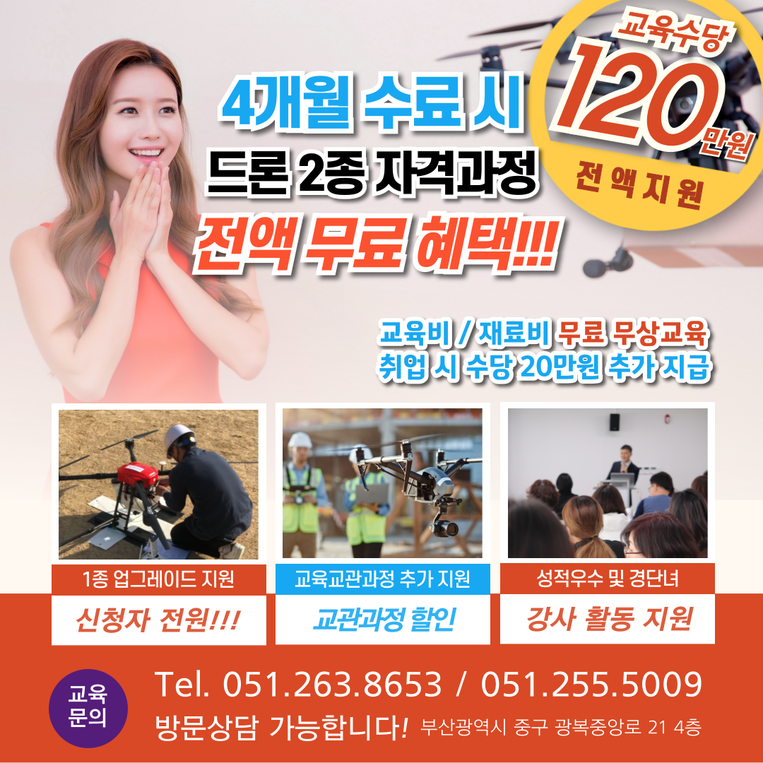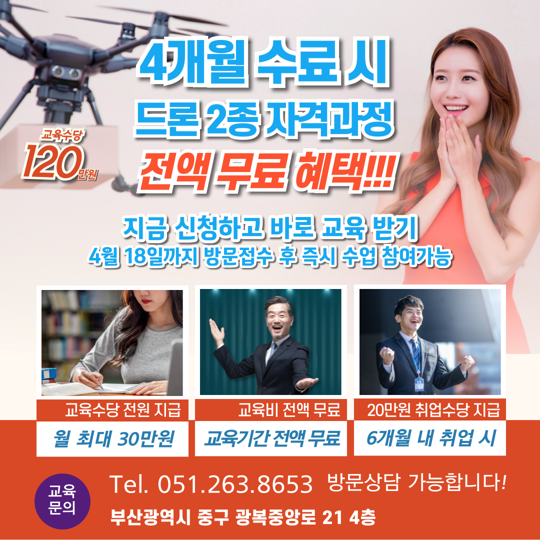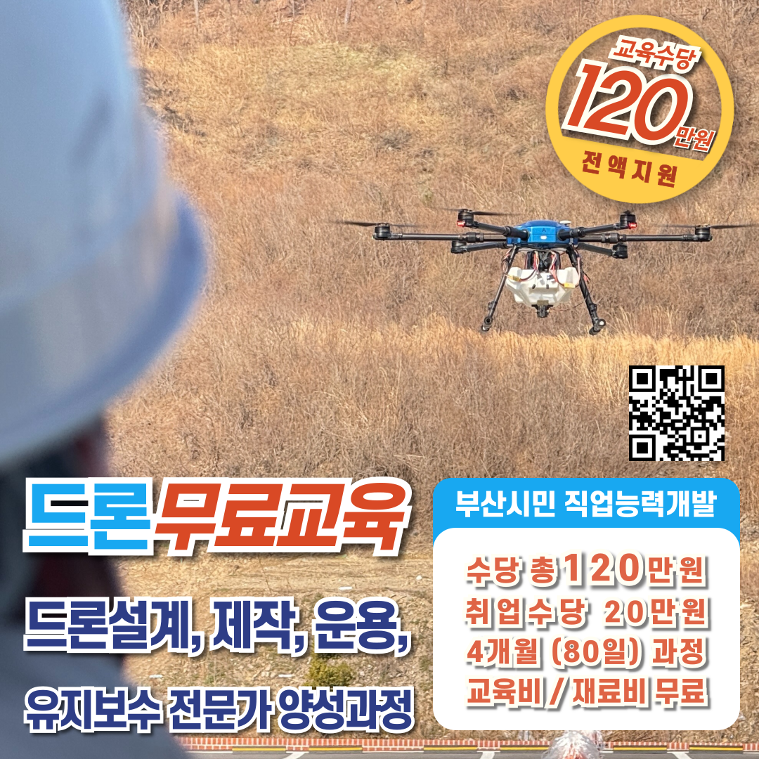안녕하세요 마스터환입니다. 부산시민이라면 누구나 신청 가능한 드론 전문가 양성과정이 열립니다! 드론 제작·설계·운용·유지보수까지 4개월 동안 실무 중심의 체계적인 교육을 무료로 받을 수 있으며, 매달 훈련수당 30만원이 지급되는 알찬 기회입니다. 특히 폐업한 소상공인에게는 무려 2배의 수당, 최대 240만원이 지급되는 특별 혜택까지! 선착순 마감이므로 서두르셔야 합니다!