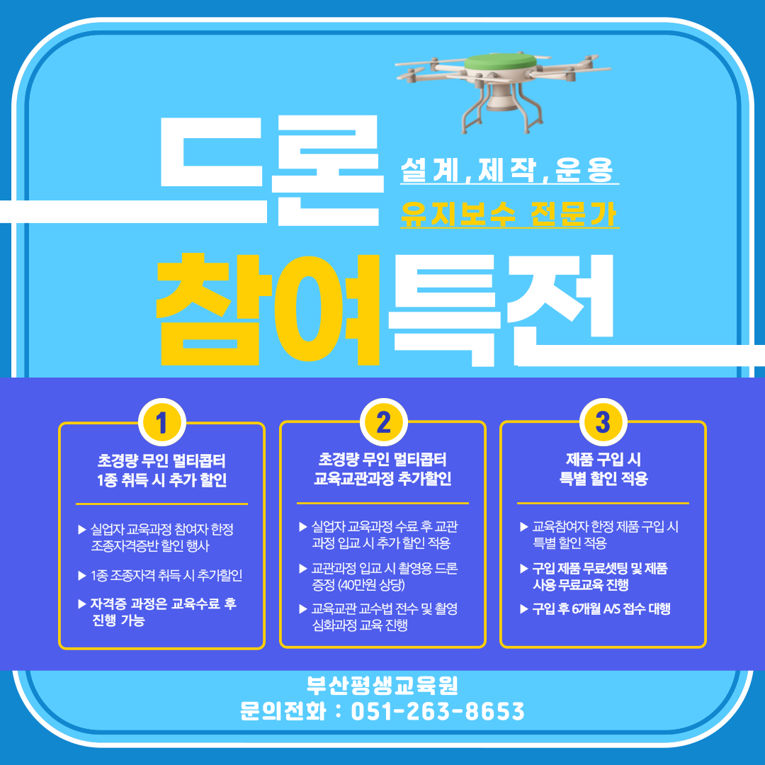 새로운 기술, 새로운 기회! 드론 전문가로의 길이 열려 있습니다. 특히 폐업 소상공인 여러분! 수당 2배의 혜택을 꼭 잡으세요. 지금이 바로 도전할 때입니다. 부산이 준비했습니다!